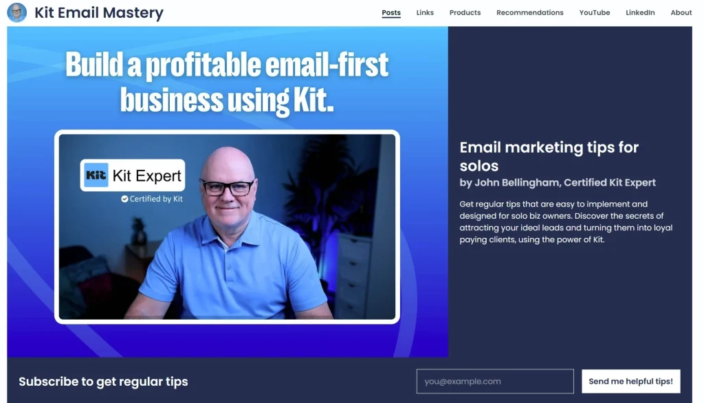 Instead of needing a full website, Kit gives you a “link-in-bio” style landing page that acts as your newsletter’s home.