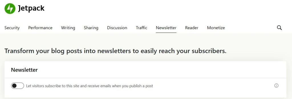 With Jetpack installed, all you have to do is enable the newsletter feature at the click of a button.