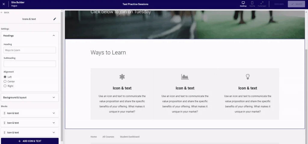 A drag-and-drop editor that lets you build a full website around your courses, not just a landing page. You easily add in different blocks to edit and adjust your website’s design.