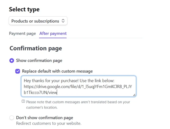 We now have “show confirmation page replace default with a custom message.” You can say something like “thank you for your purchase use the link below” and link to the location on Google Drive.