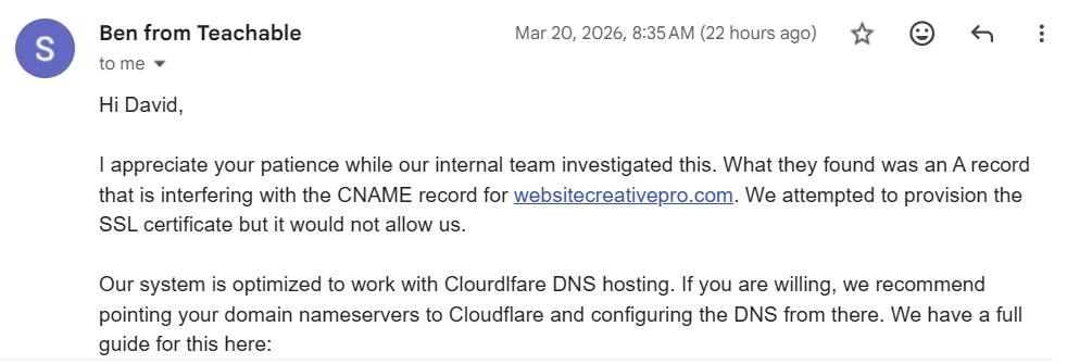 Their immediate solution was to set my course website back to a sub domain on Teachable (my-course-website.teachable.com), but my students don’t know that. They visit the domain and the site is just gone as far as they can tell.